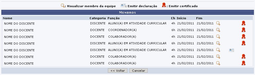 Neste tela será possível Visualizar membro da equipe, Emitir declaração e Emitir certificado.