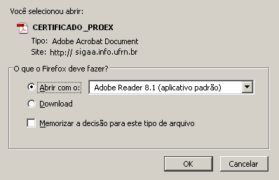 O sistema exibirá a tela para que o usuário opte entre realizar o download ou abrir o arquivo.