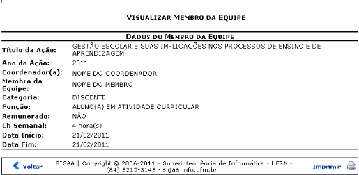 Caso deseje visualizar os participantes da ação de extensão, o usuário deverá clicar no link Clique aqui para visualizar os participantes desta ação de extensão na área correspondente aos membros da equipe.