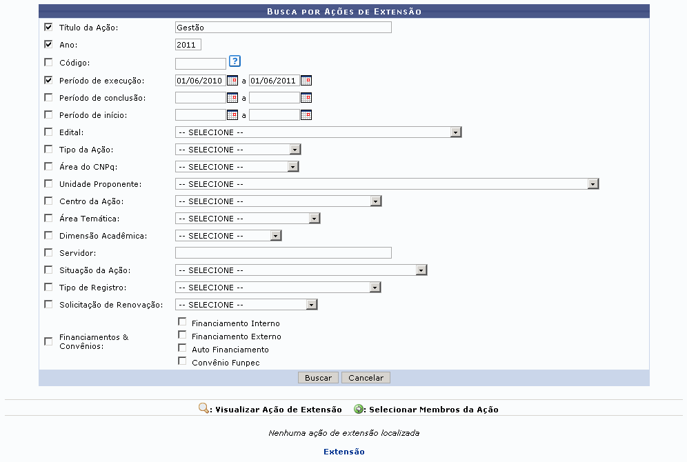 Exemplificaremos a busca informando o Título da Ação Gestão, o Ano 2011 e o Período de execução de 01/06/2010 a 01/06/2011.