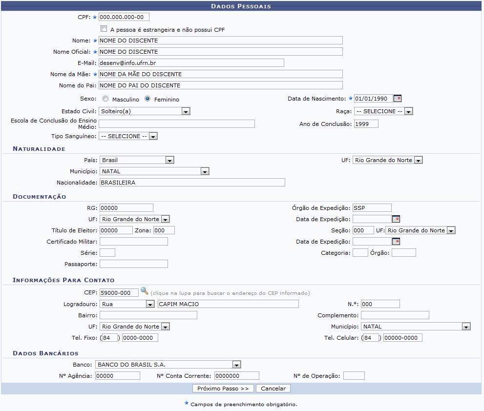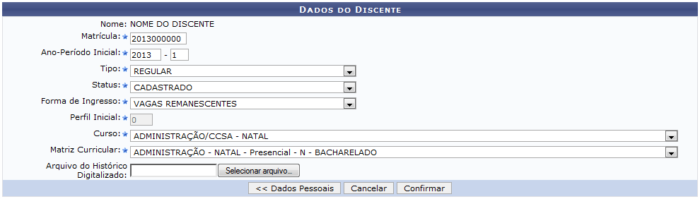 Clique em Enviar para prosseguir com a ação. A seguinte página será gerada pelo sistema permitindo que o usuário informe os Dados Pessoais do discente.