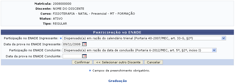 Esta funcionalidade permite que o usuário atualize a informação de participação do discente de graduação no ENADE - Exame Nacional de Desempenho de Estudantes.