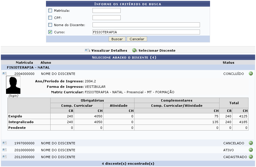 Para realizar a seleção do discente desejado o usuário deverá clicar no ícone Seta. A tela seguinte será apresentada pelo sistema.
