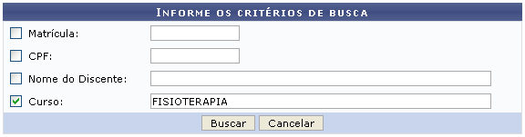 Para dar prosseguimento com a operação clique em Buscar. A página a seguir será gerada pelo sistema permitido que o usuário Selecione Abaixo o Discente.