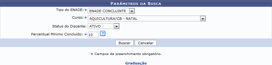 Confirme a operação clicando em Buscar. Exemplificaremos a operação com o Tipo do ENADE ENADE CONCLUINTE, Curso AQUICULTURA/CB - NATAL, Status do Discente ATIVO e o Percentual Mínimo Concluído 10 . A seguinte tela será exibida: