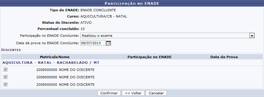 Os discentes que serão cadastrados para participar do ENADE deverão estar marcados no campo do lado esquerdo de seus nomes. Para dar continuidade a operação clique em Confirmar. Exemplificaremos a operação com a Participação no ENADE Concluinte Realizou o exame, a Data da prova no ENADE Concluinte 08/07/2013 e selecionando todos os discentes listados. A seguinte mensagem de confirmação será exibida pelo sistema: