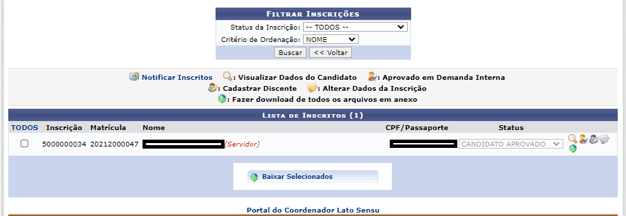 Na “Lista de Inscritos” o Coordenador Lato deverá selecionar o discente que deseja cadastrar, observando que o status deverá constar como “Aprovado”.