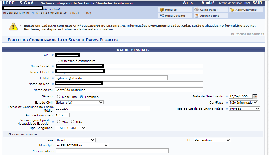 Caso haja alguma alteração a ser realizada nas telas de “Dados Pessoais”, “Documentação” ou “Dados Acadêmicos”, basta clicar nos botões correspondentes e proceder aos ajustes.