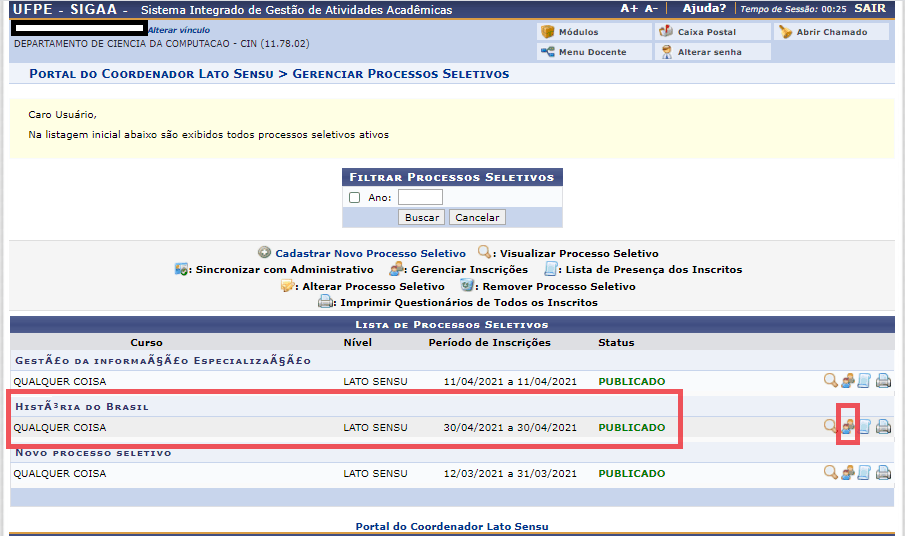 No campo destinado a listagem dos processos seletivos, o Coordenador ou Secretário deverá selecionar o curso em que deseja cadastrar o discente e em seguida clicar no ícone “Gerenciar inscrições”.