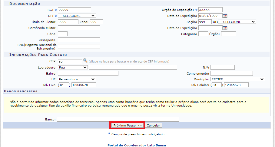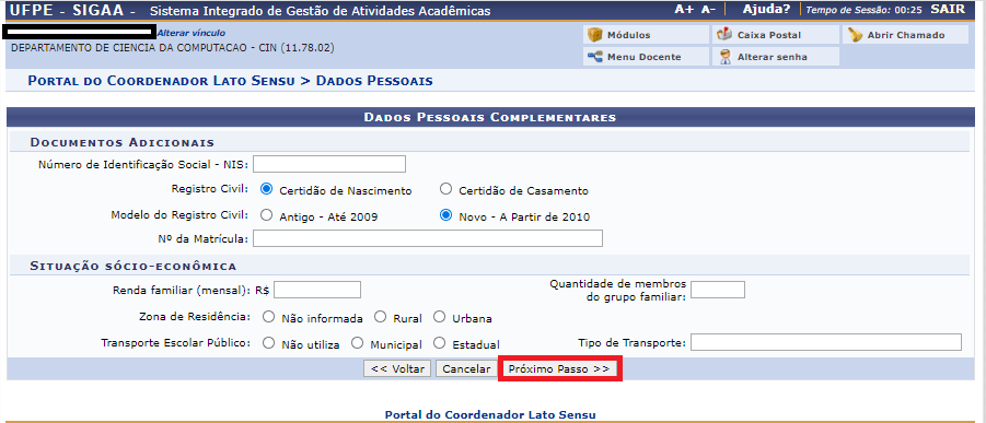O Coordenador ou Secretário de Curso deverá observar se todos os campos estão preenchidos corretamente e em seguida deverá clicar em “Próximo Passo”.