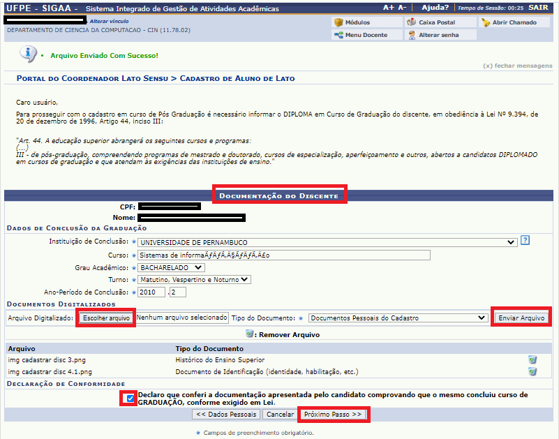 Ao final, deve-se selecionar a caixinha referente à declaração de conformidade, onde o Coordenador ou Secretário de curso declaram que conferiram a documentação apresentada pelo candidato, comprovando que o mesmo concluiu o curso de Graduação, conforme exigido em lei.
