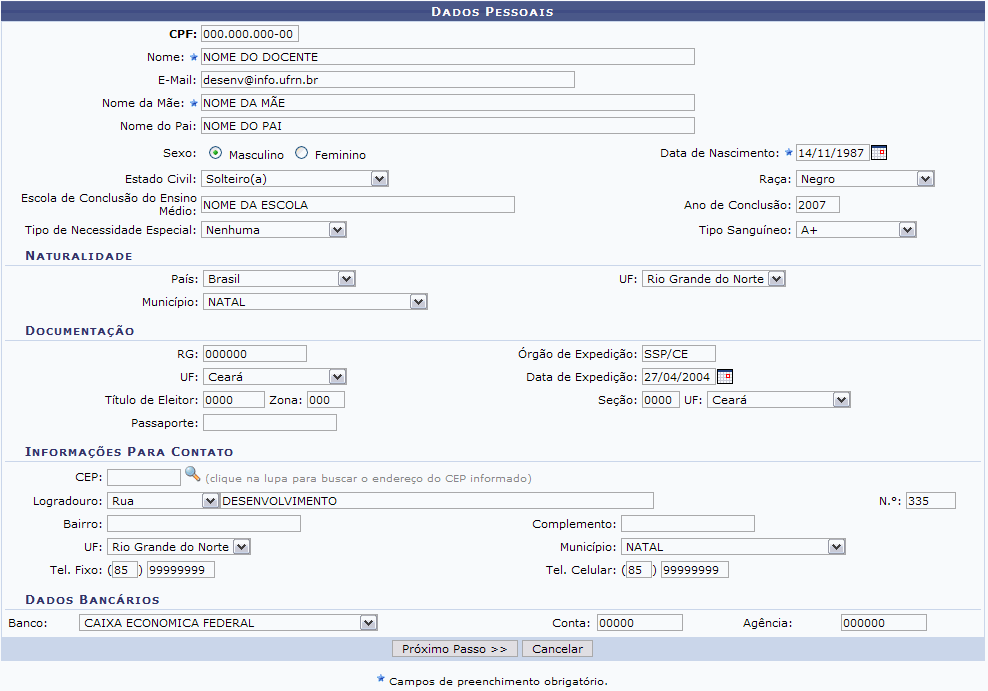 Os dados que devem ser informados para o cadastro do docente, sendo ele estrangeiro ou não, são: