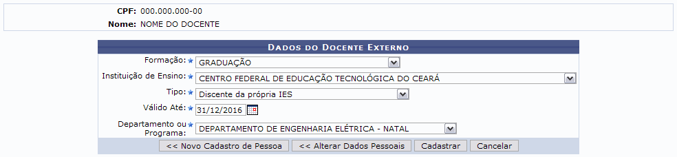 A seguir, a tela para preenchimento dos Dados do Docente Externo será exibida.