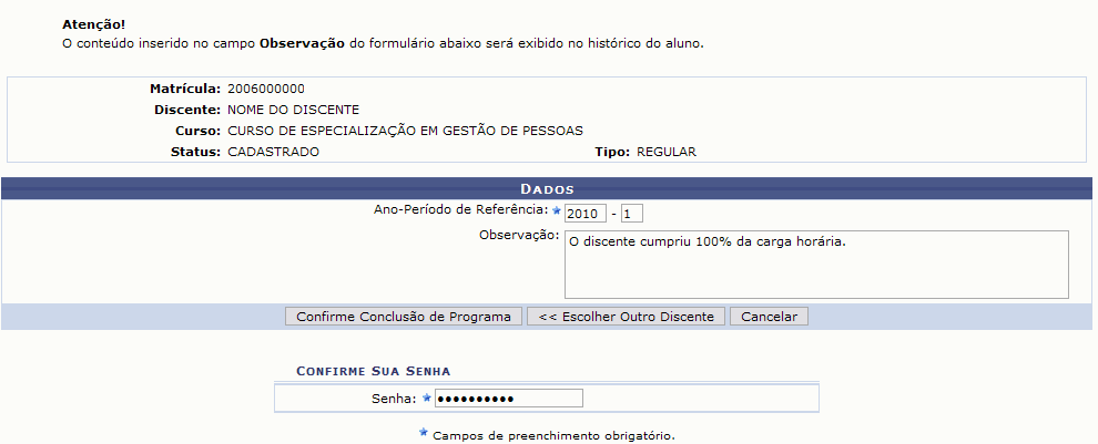 Além destes dados, é necessário também que o usuário que esteja executando a ação confirme a senha do SIGAA. Este dado deve inserido em Senha.