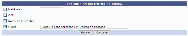 Os critérios que podem ser informados à busca do discente são Matrícula, CPF, Nome do Discente e Curso. O usuário pode escolher uma ou mais opções com a finalidade de refinar a busca a ser realizada.