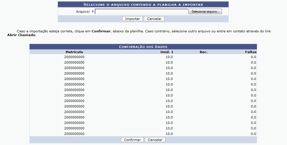 Caso a importação esteja correta, clique em Confirmar, abaixo da planilha.