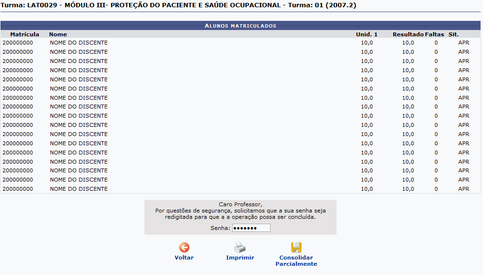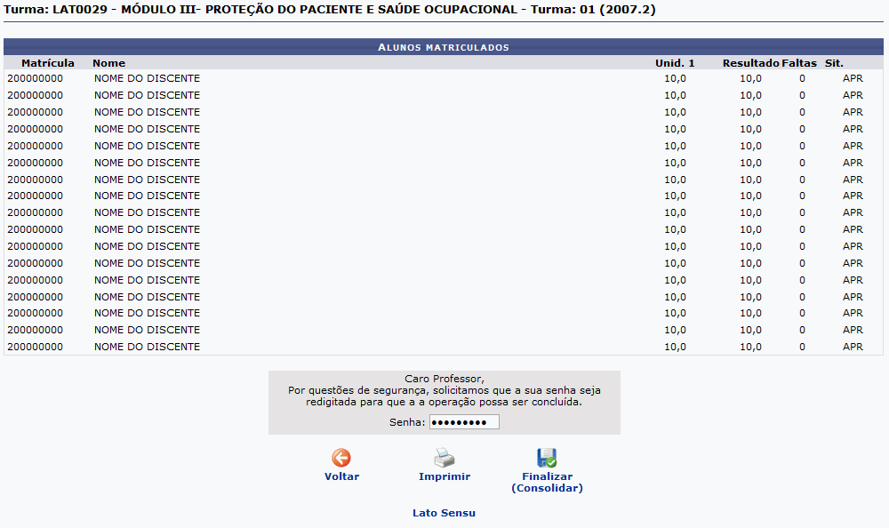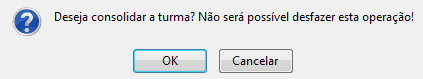 Se estiver certo da consolidação da turma, clique em OK. O usuário não poderá alterar os dados após a consolidação. A seguinte página será exibida: