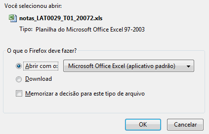 A partir do ícone Exportar Planilha, o usuário poderá Exportar Planilha, ou seja, abrir no próprio computador a lista com discentes e suas respectivas notas. A seguinte página caixa de diálogo será exibida: