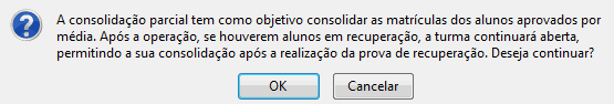 O ícone Consolidação Parcial, deverá ser utilizado para realizar, como o nome diz, uma consolidação parcial da turma, as informações serão salvas e será possível realizar alterações posteriores. Ao clicar sobre ele a seguinte caixa de diálogo será exibida: