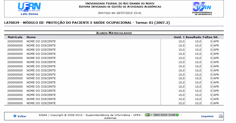 Caso queira Imprimir o documento, clique em , essa opção será mesma nas demais páginas que estiver contida. O documento com as notas dos discentes, será exibido em formato de relatório, como mostrado a seguir: