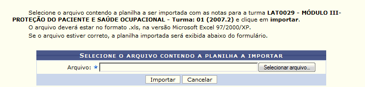 O usuário deverá selecionar o arquivo contendo a planilha a ser importada com as notas para a turma LAT0029 - MÓDULO III- PROTEÇÃO DO PACIENTE E SAÚDE OCUPACIONAL - Turma: 01 (2007.2). Para selecionar a planilha, clique em Selecionar Arquivo…. Será necessário realizar o download do arquivo para importá-lo. Após selecionar o arquivo, clique em Importar.