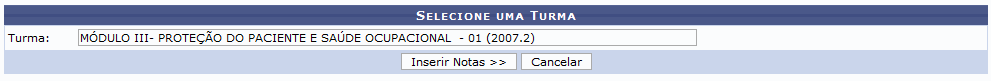 Para dar continuidade, informe a Turma que deseja consolidar. Após informar os dados necessários, clique em Inserir Notas. Exemplificamos com LAT0029 - MÓDULO III- PROTEÇÃO DO PACIENTE E SAÚDE OCUPACIONAL - Turma: 01 (2007.2). Será exibida a seguinte página: