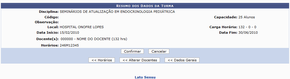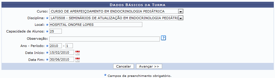 Exemplificamos com o Curso de Aperfeiçoamento em Endocrinologia Pediátrica, a Disciplina LAT0508- Seminários de Atualização em Endocrinologia Pediátrica, o Local com Hospital Onofre Lopes, a Capacidade de Alunos será 25 e o Ano-Período 2010.1. Além disso, incluímos a Data Início: 15/02/2010 e Data Fim: 30/06/2010.