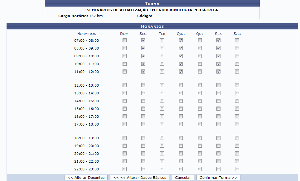 Se quiser retornar a página anterior e editar os dados, clique em Dados Básicos da Turma. Para dar continuidade clique em Definir Horários.