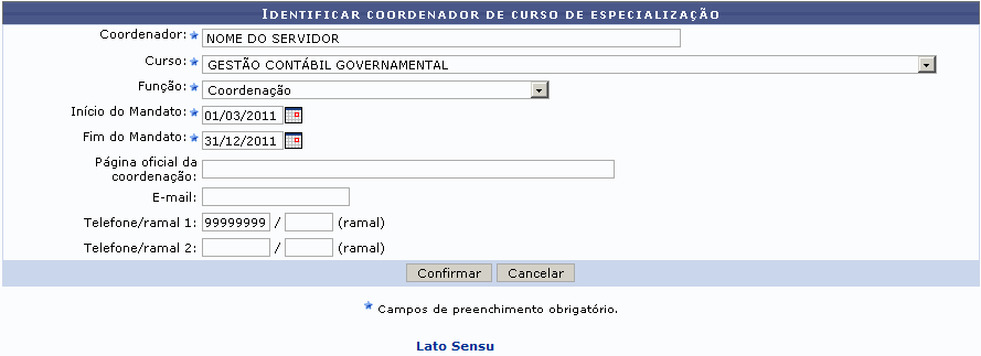 Esta operação permite cadastrar os dados de um servidor para identificá-lo no sistema como coordenador de um curso de especialização, informando seus dados e período de vigência do mandato.