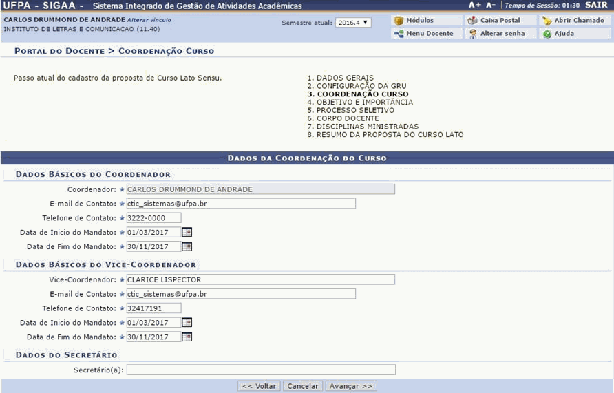 Neste passo poderão ser cadastrados o coordenador, vice-coordenador e secretário do curso, conforme os dados mostrados a seguir: