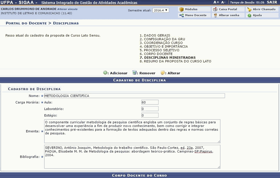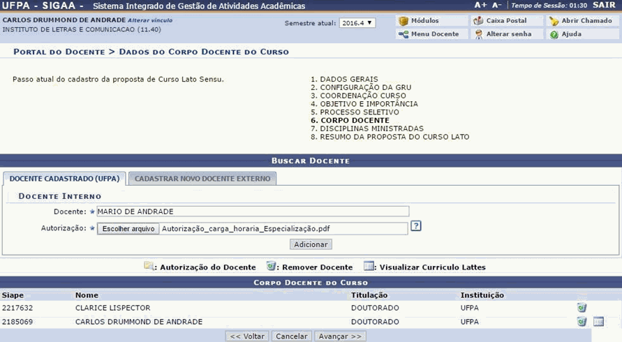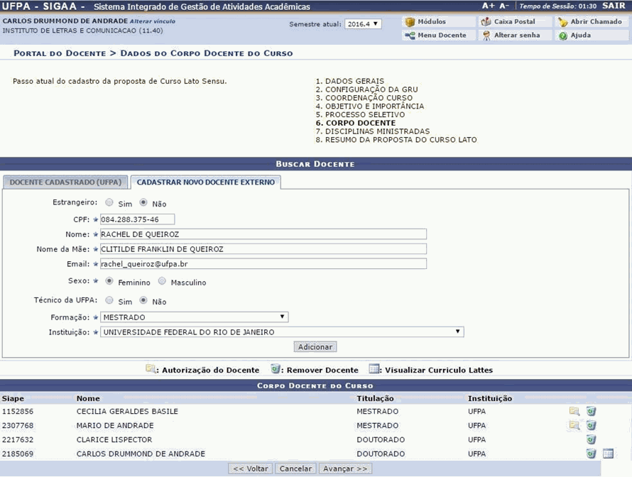 Após fornecer os dados necessários, clique em Adicionar e o docente será incluído na lista de docentes do curso.