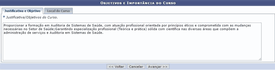 Nesta página, o usuário deverá incluir a Justificativa/Objetivos do Curso, descrevendo uma justificativa e os objetivos do curso a ser realizado; além de disponibilizar o Local do Curso. Clique em Avançar para seguir adiante. O sistema exibirá a tela a seguir: