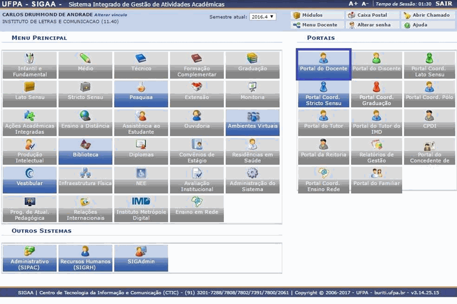 - Portal do Discente: o discente poderá acompanhar seus conceitos lançados por meio de impressão de histórico, emitir declarações e outras operações.