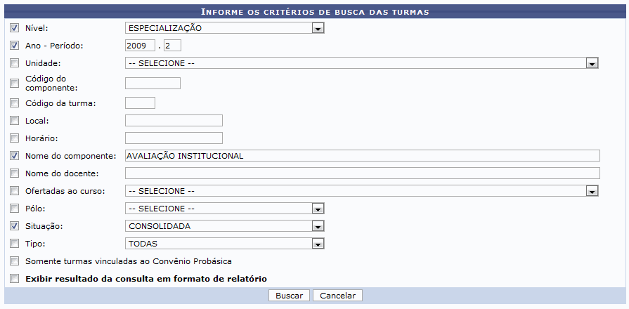 Exemplificamos o Nível com Especialização, Ano-Período: 2009.2; Nome do Componente com Avaliação Institucional e em Situação selecionamos a opção Consolidada.