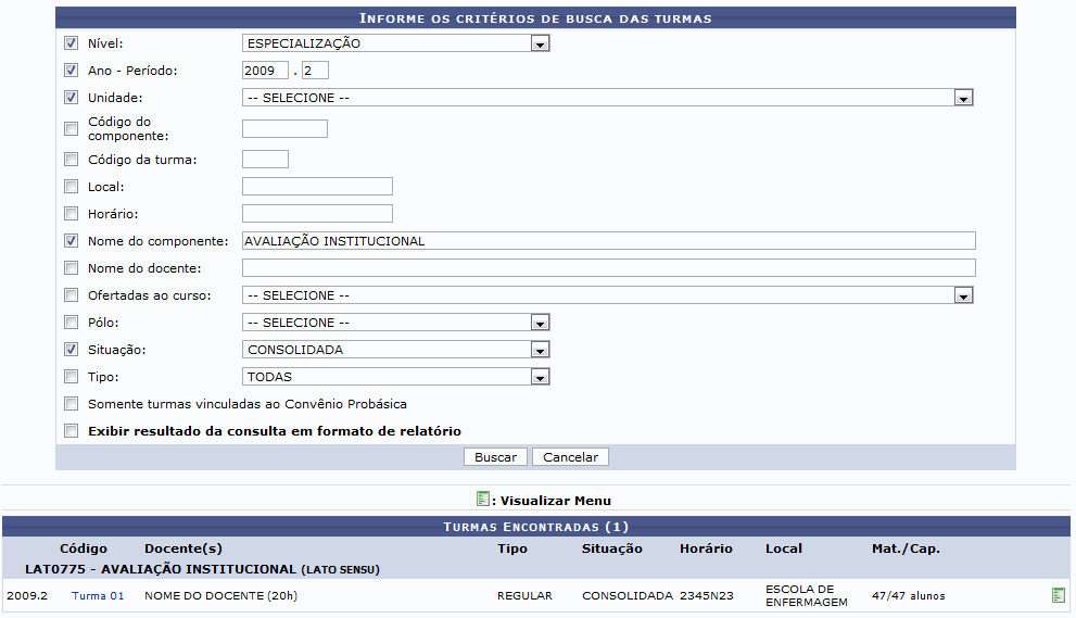 Para Visualizar Turma, clique em Visualizar Turma. Será exibida a página a seguir: