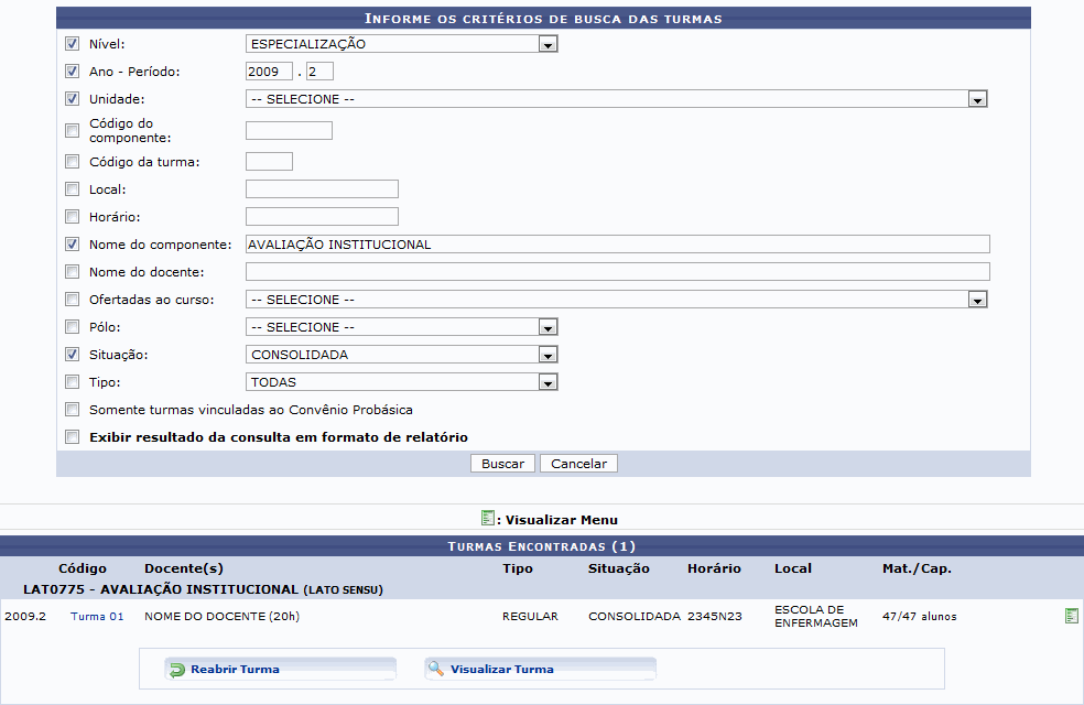 Para procurar por uma turma para reabrí-la, informe alguns dos dados a seguir. Quanto mais informações forem fornecidas, mais refinado será o resultado.