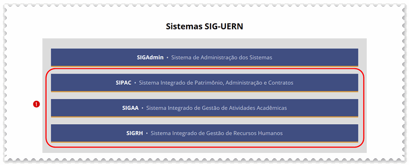a) Acesse https://sistemas.uern.br e clique em (1) qualquer um dos sistemas;