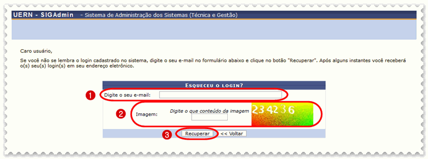 c) Preencha o (1) e-mail cadastrado, (2) o conteúdo da imagem e clique em (3) recuperar;