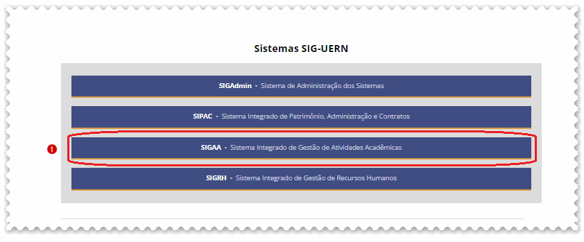 a) Acesse https://sistemas.uern.br e clique em (1) SIGAA Sistema Integrado de Gestão de Atividades Acadêmicas;
