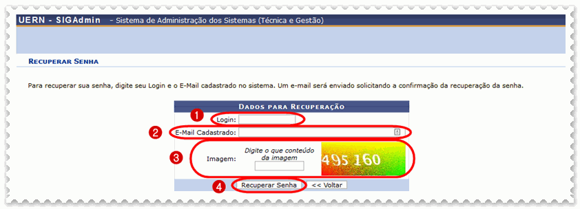 c) Preencha o (1) login, (2) e-mail cadastrado, (3) o conteúdo da imagem e clique em (4) recuperar senha;