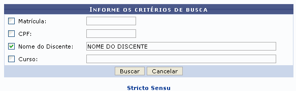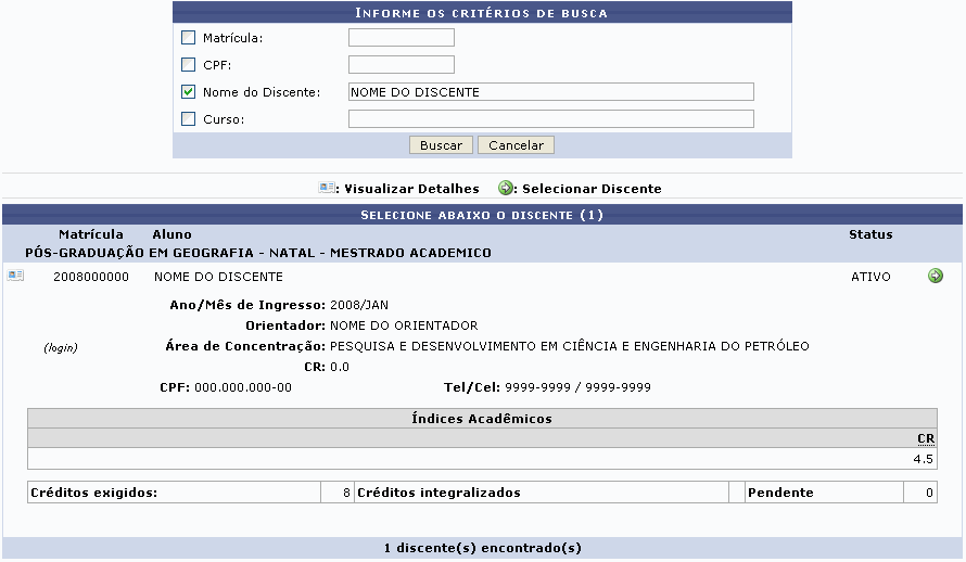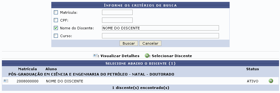 Exemplificaremos com o Nome do Discente. Ao clicar em Buscar, aparecerá a seguinte tela: