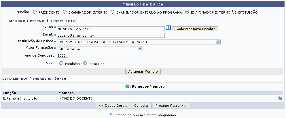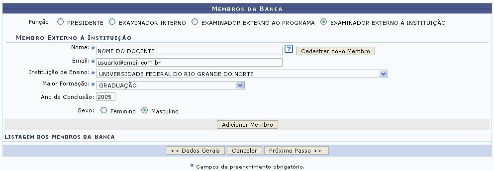 Exemplificaremos o cadastro do membro da banca externo à instituição da seguinte forma: