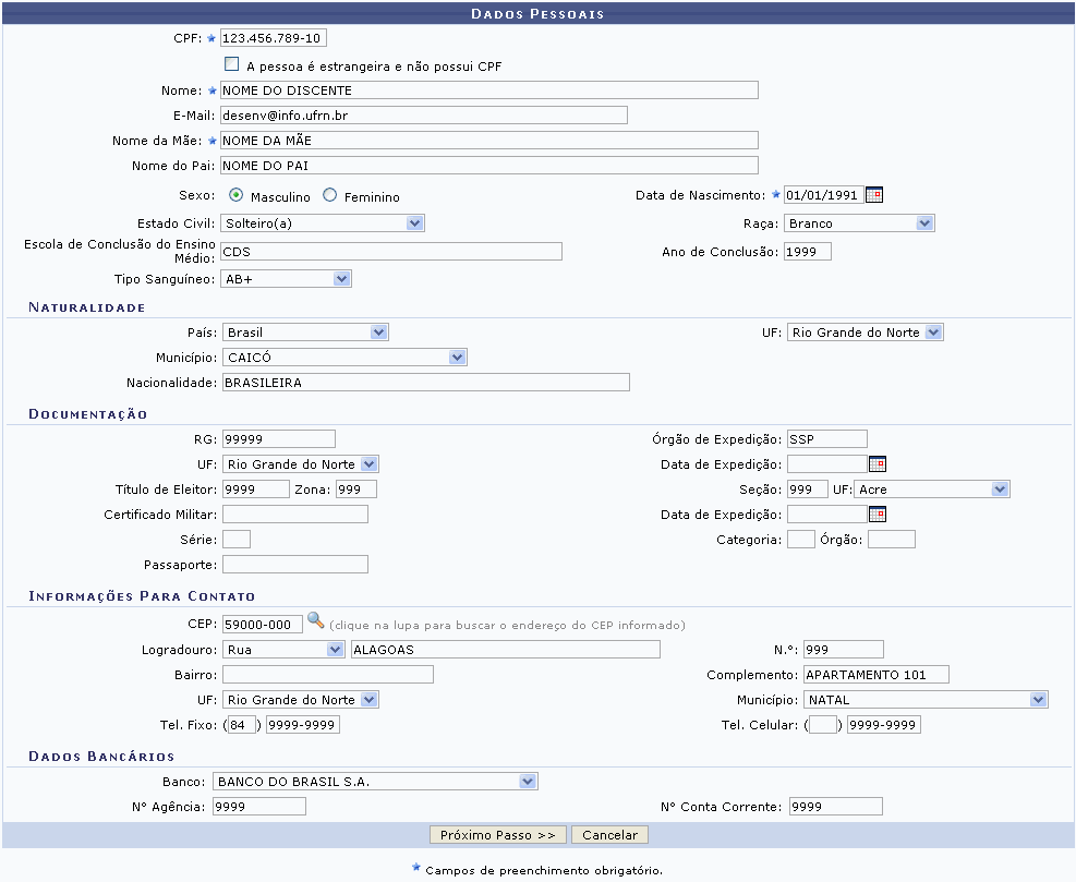 Na tela acima, o usuário fornecerá informações pessoais do discente. Caso o discente esteja vinculado à Instituição, todos os dados contidos já virão preenchidos. Para o contrário, será necessário ceder informações a respeito dos dados pessoais do aluno, sua naturalidade, documentação, informações para contato e dados bancários. No caso de ter selecionado anteriormente a opção para discentes estrangeiros, também será obrigatório digitar o número do Passaporte do discente.