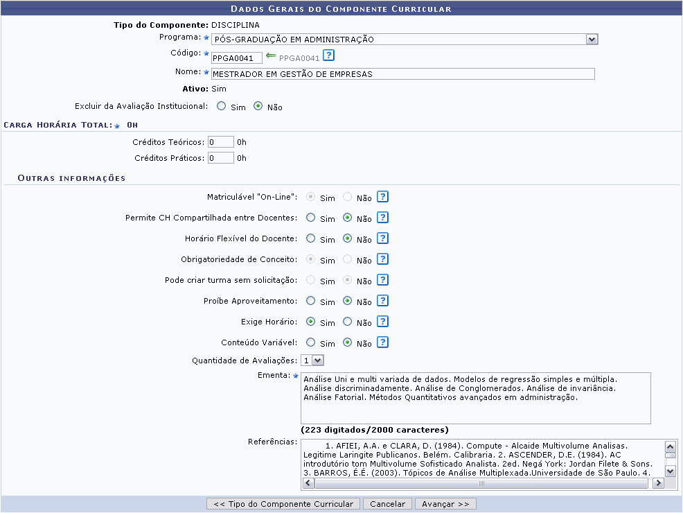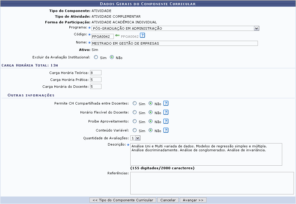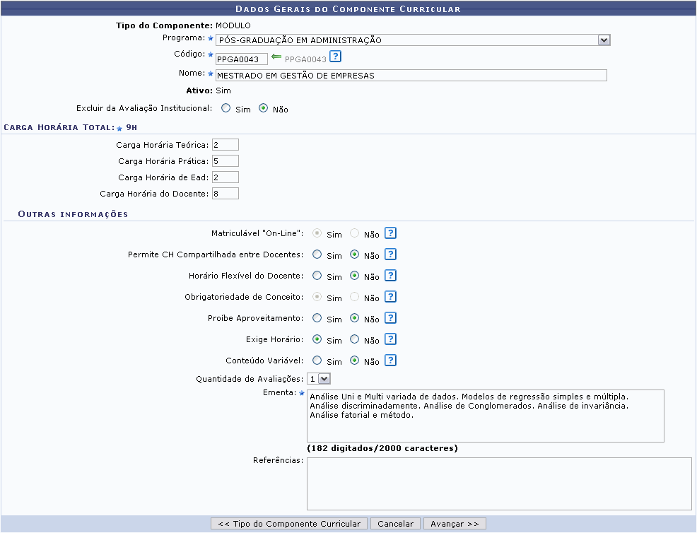 Após informar os dados necessários, clique em Avançar. A seguinte página para o preenchimento dos Dados Gerais do Componente Curricular será carregada: