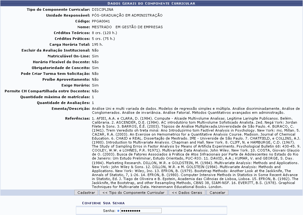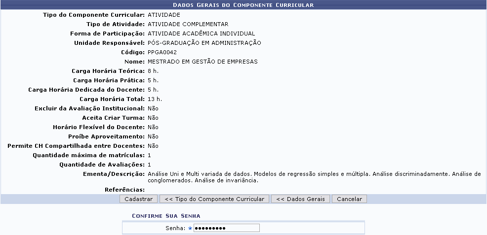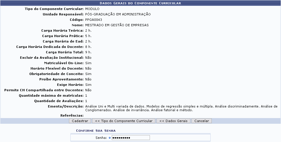 Para confirmar o cadastro, o usuário deverá inserir novamente sua Senha de acesso ao SIGAA e clicar em Cadastrar. O sistema retornará automaticamente para a aba de Cadastros no módulo Stricto Sensu, com a seguinte mensagem de confirmação no topo: