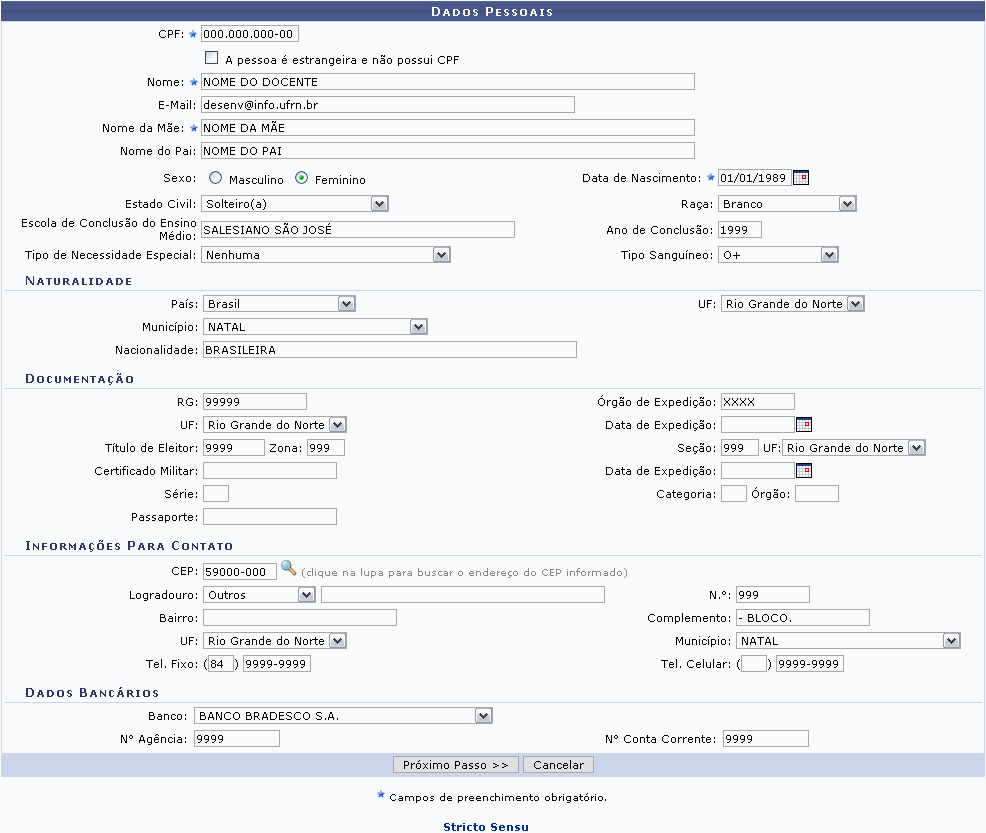 Serão apresentados os dados pessoais do usuário a serem preenchidos ou atualizados, são eles:
