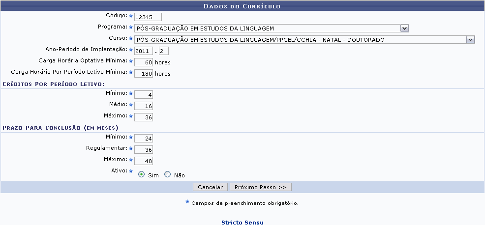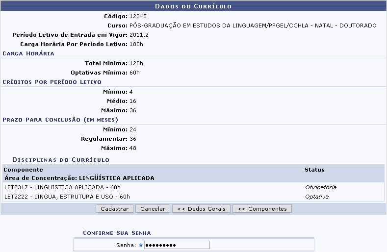Como exemplo, utilizaremos o Código 12345, Programa PÓS-GRADUAÇÃO EM ESTUDOS DA LINGUAGEM, Curso PÓS-GRADUAÇÃO EM ESTUDOS DA LINGUAGEM/PPGEL/CCHLA/ - NATAL - DOUTORADO, Ano-Período de Implantação 2011.2, Carga Horária Optativa Mínima 60horas, Carga Horária Por Período Letivo Mínima 180horas; os créditos Mínimo 4, Médio: 16 e Máximo 36; o prazo para conclusão Mínimo 24, Regulamentar 36, Máximo 48 e Ativo Sim.