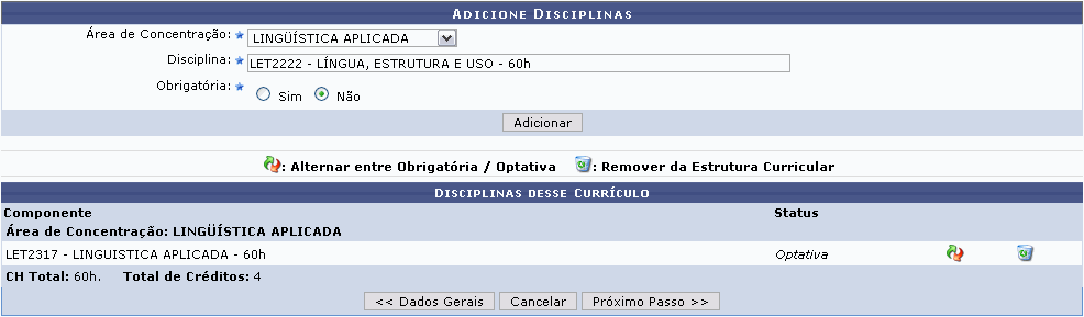 O usuário também deverá informar se a disciplina será Obrigatória ou não. Após inserir os dados descritos, clique em Adicionar. A página será recarregada da seguinte forma: