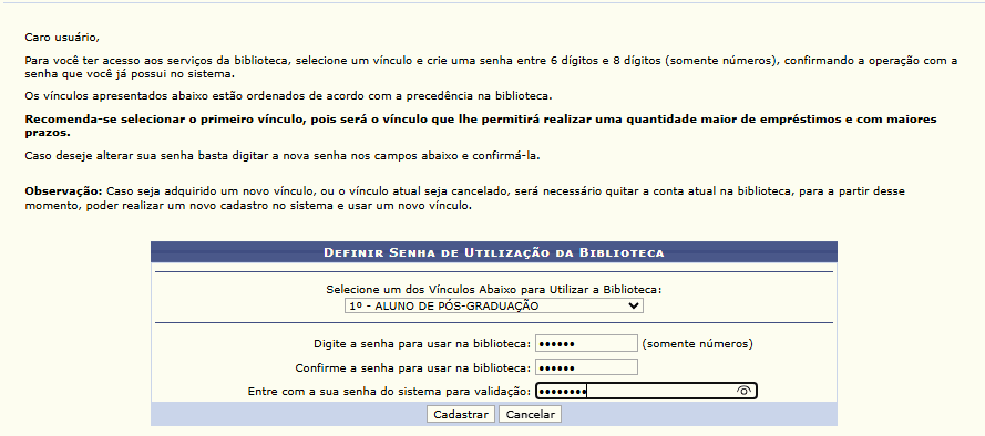 Na tela seguinte, o discente deverá digitar sua senha de utilização da biblioteca, depois confirmar e entrar com sua senha do sistema para validação e clicar em CADASTRAR. Conforme imagem a seguir: