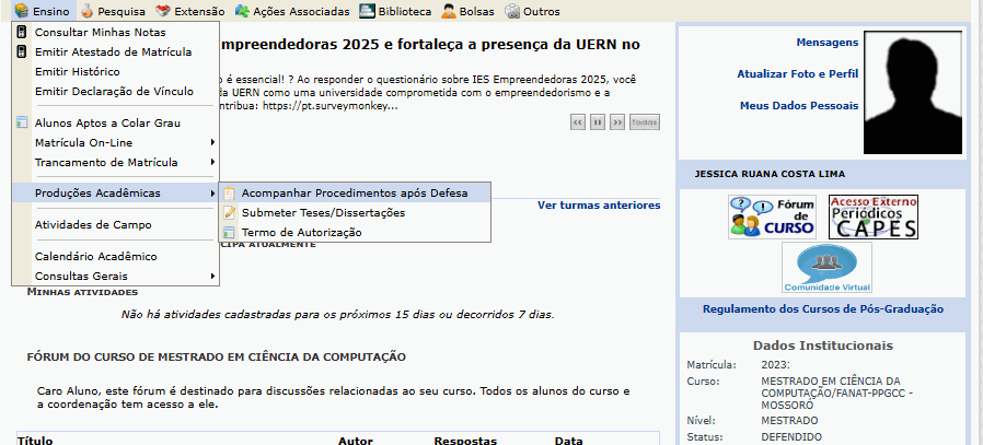 PORTAL DISCENTE > ENSINO > PRODUÇÕES ACADÊMICAS > ACOMPANHAR PROCEDIMENTOS APÓS DEFESA
